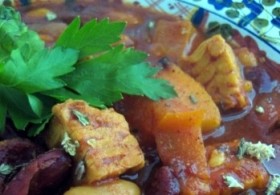 Butternut squash is diced, roasted until caramelized and tossed with tempeh and tomatoes in this satisfying chili. Tempeh and kidney beans stirred into the mix and seasoned with oregano, cumin, onion powder and turmeric.